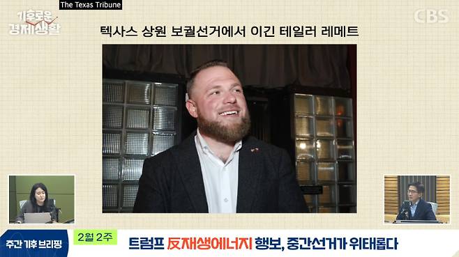 ◇ 최서윤> 보궐선거라서 임기가 그렇게 오래 남지 않았잖아요. 올해 11월에 다시 선거가 치러질 텐데 그때 이 텍사스 결과가 어떻게 나오는지 지켜볼 필요가 있을 것 같아요. 여기에 더해서 트럼프랑 공화당 의원들을 웃을 수 없게 하는 이야기들이 계속 나오고 있다고 해요. 트럼프 대통령 대표적인 정책이 화석연료로의 복귀와 재생에너지 중단이잖아요.