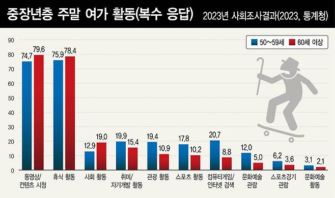 아래 그림은 50대 이상 연령층의 주말 여가 활동을 나타낸 것이다. 파란색이 50대, 빨간색이 60대 이상이다. 양쪽 모두 동영상/콘텐츠를 시청하거나 휴식을 취하는 비중은 높지만, 취미나 자기 계발, 스포츠 활동 등에 투여하는 시간은 상대적으로 적다는 사실을 알 수 있다. 주로 TV나 휴대전화를 들여다보면서 소일한다는 뜻이다.