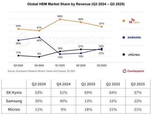 카운터포인트리서치에 따르면 글로벌 HBM 시장에서의 매출 기준 시장 점유율은 지난해 3분기 기준 SK하이닉스가 57%, 삼성전자가 22%, 마이크론이 21%에 달한다.