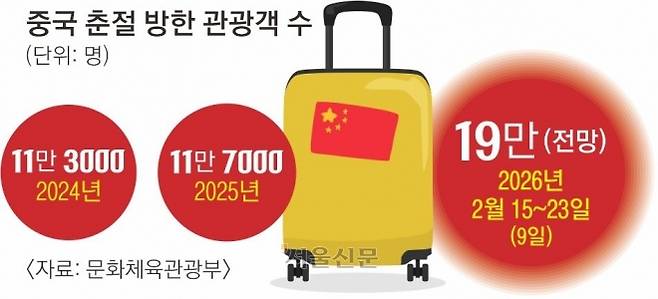 앞서 문화체육관광부와 한국관광공사는 이번 춘절 연휴 기간 한국을 방문하는 중국인 관광객을 최대 19만명으로 예상했다. 이는 지난해 춘제 기간 일평균과 비교해 44% 늘어난 규모다.