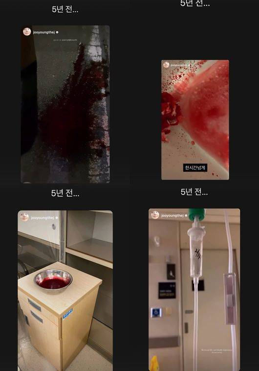 해당 영상에는 아스팔트 도로 위에 피가 흥건한 모습이 담겼다. 이에 차주영은 "코피가 안 멈춰 또 시작"이라고 털어놨다. 이어진 영상에는 세면대에 끝없이 피가 쏟아지는 장면이 담겼고, 차주영은 "한시간 넘게"라고 설명을 덧붙였다. 한시간이 넘는 시간동안 피가 멈추지 않았다는 것.