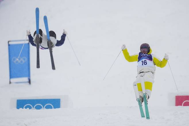 [리비뇨=AP/뉴시스] 윤신이(왼쪽)가 14일(현지 시간) 이탈리아 리비뇨 에어리얼 모굴 파크에서 열린 2026 밀라노·코르티나담페초 동계올림픽 여자 듀얼 모굴 32강에서 율리야 갈리셰바(카자흐스탄)와 경기하고 있다. 윤신이가 6-29로 패해 16강에 오르지 못했다. 2026.02.15.