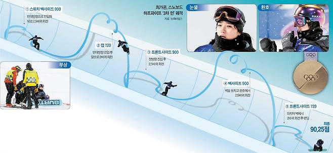 3차 시기에서 기적 같은 퍼포먼스를 펼친 최가온은 가장 높은 90.25점을 받았다. 그는 “1, 2차 시기에서 모두 넘어지고 나니 차라리 후회 없이 후련하게 탈 수 있는 걸 다 보여주겠다는 마음이 들었다. 이렇게 아프고 눈이 오는 와중에도 ‘내가 성공했구나’ 감정이 찾아와 울컥했다”고 했다. 자신에게 똑같은 점수 ‘90점’을 준 최가온은 “올림픽을 준비하면서 좀 난이도 높은 트릭들을 많이 연습했는데 좀 못 보여드려서 아쉽긴 하다. 눈도 오고 다리도 안 좋은데 난이도를 좀 낮추는 게 현명하지 않겠냐고 코치님이 말씀해주셔서 따랐다”면서 “높이도 중요하다고 생각하고 다양한 스핀이 장기이기 때문에 많이 살려서 하려고 노력했다”고 했다.