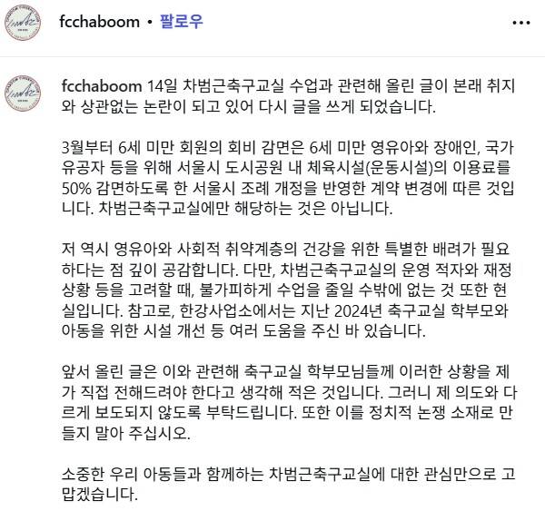 이어 "차범근축구교실 운동장은 서울시에서 임대를 받아 운영하고 있다. 그래서 모든 업무는 서울시와 시설관리공단의 규정을 따르고 있다. 서울시는 2026년 3월부터 6세 미만 회원들의 회비를 30,000원으로 새롭게 규정했다. 매우 난감한 상황이다. 많은 고민과 회의를 거치면서 부득이하게 반을 줄여 적자의 폭을 줄이는 방법으로 결정하게 됐다. 참으로 아쉽다"라고 덧붙였다.