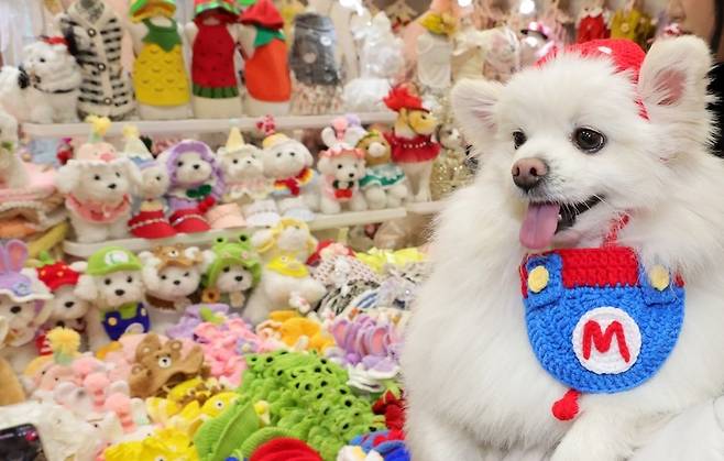 [7일 경기도 고양시 킨텍스 제2전시장에서 열린 반려동물 용품 박람회 '2025 펫쇼 코리아'에서 견주와 함께 나온 반려견이 패션가게 앞에 서 있다. (사진=연합뉴스)]