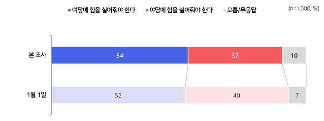 오는 6월 3일 치러지는 지방선거를 두고는 응답자의 54%가 '현 정부의 국정안정을 위해 여당에 힘을 실어줘야 한다', 37%는 '현 정부를 견제하기 위해 야당에 힘을 실어줘야 한다'라고 답했습니다.