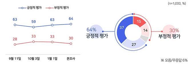 대통령 국정운영 평가에서 응답자의 64%는 이재명 대통령이 국정운영을 '잘하고 있다'는 긍정적 평가를 했고, 30%는 '잘못하고 있다'는 부정적 평가를 내렸습니다.