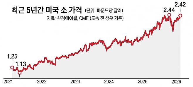 14일 한경에이셀 등에 따르면 미국 시카고상업거래소(CME)의 최근 생우 가격은 파운드당 2.4달러를 넘나들고 있다. 1년 전 2달러를 밑돌았다가 20% 넘게 올랐다. 미국 소고기값 상승세는 5년 넘게 이어지고 있다. 2021년 중반까지만 하더라도 파운드당 1~1.2달러 사이에서 움직였던 가격이 지속적으로 상승 중이다.