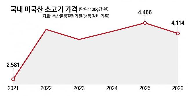미국 현지 소값 상승은 국내 시장에 곧바로 영향을 미치고 있다. 축산물품질평가원에 따르면 미국산 소고기 갈비(냉동) 가격은 2023년 평균 100g당 3912원에서 지난해에는 4466원으로 14.1% 올랐다. 올해 2월 가격도 4436원으로 집계됐다. 올들어 미국산 소고기 관세(1.2~4.8%)가 완전히 사라졌는데도 가격 인하 효과를 내지 못했다.