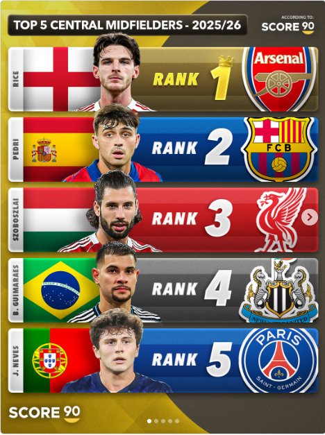이 답을 유럽 축구 매체 ‘스코어90’이 내렸다. 이 매체는 2025-26시즌 최고의 미드필더 TOP5를 선정했다.