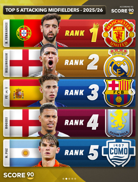 이 매체는 2025-26시즌 최고의 미드필더 TOP5를 선정했다.