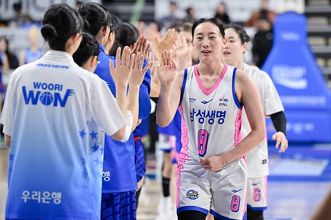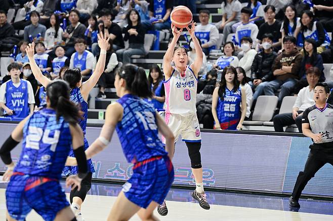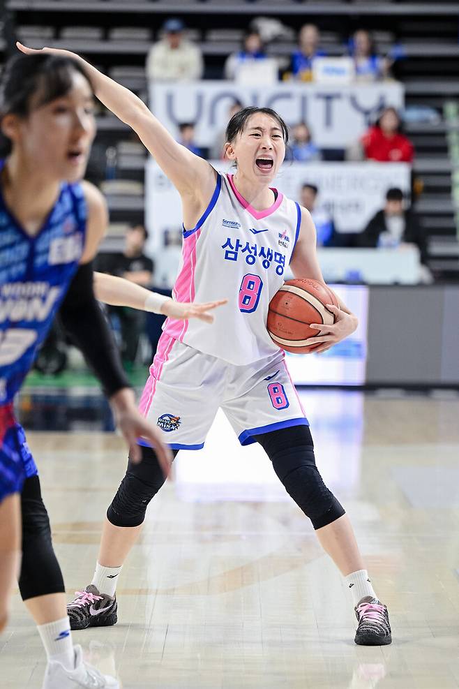 용인 삼성생명은 15일 아산이순신체육관에서 BNK금융 2025~2026 여자프로농구 정규리그 아산 우리은행과 5라운드 맞대결에서 혈투 끝에 58-56으로 이겼다. 시즌 12승 12패, 5할 승률을 맞추며 3위로 올라선 삼성생명은 플레이오프를 향한 치열한 순위 싸움을 예고했다.