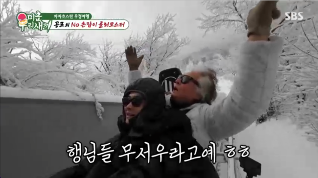 '미운 우리 새끼' 배우 이성민, 김종수, 김성균, 배정남이 카자흐스탄의 이국적인 설경 속에서 '공포의 롤러코스터'를 마주하며 반전 매력을 선사했다.