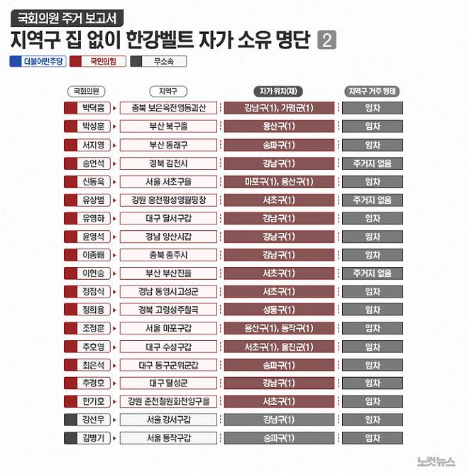 한편, 41명 가운데 5명은 지역구에 주택을 임차하지도 않고 있는 것으로 나타났다. 국민의힘 이헌승(부산 부산진을)∙유상범(강원 홍천횡성영월평창)∙송언석(경북 김천) 의원은 특히 지방에 지역구를 두고 있다.