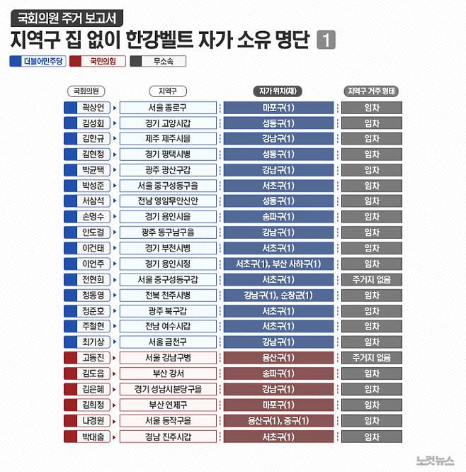 서울이 지역구인 국민의힘 고동진(서울 강남병), 민주당 전현희(서울 중구성동갑) 의원은 지역구 대신 인접 한강벨트의 자가에서 거주중인 것으로 파악됐다.