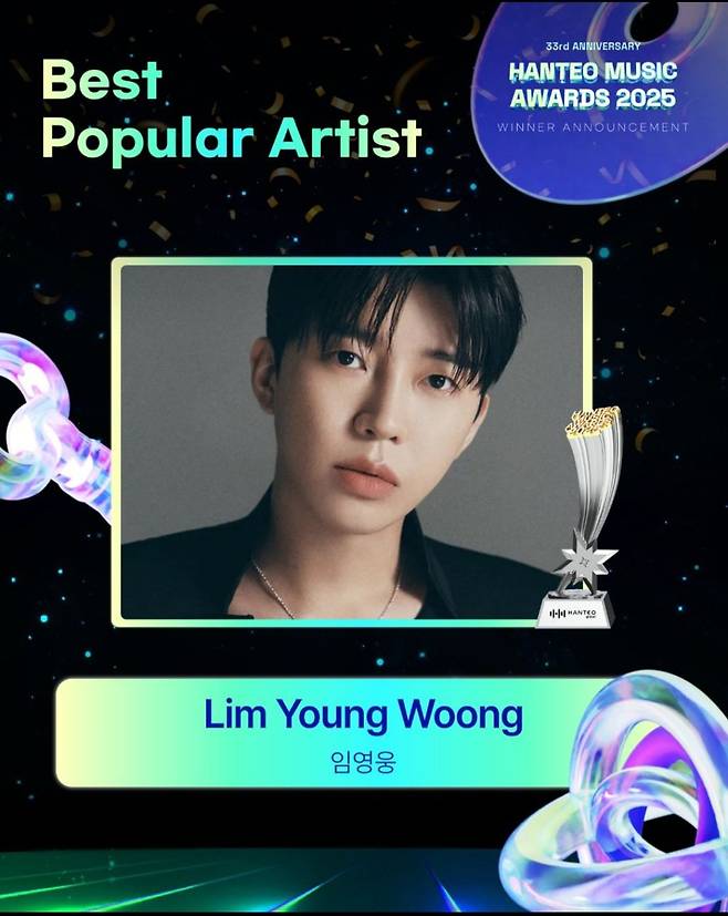 임영웅은 2월 15일 오후 서울 송파구 올림픽공원 KSPO DOME에서 열린 ‘33주년 한터뮤직어워즈 2025’에서 후즈팬덤상, 인기상, OST상을 수상했다. 이날 무대에서 이름이 세 차례 호명되며 현장의 열기를 끌어올렸다.