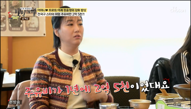 행사를 많이 다니는 탓에 차가 많이 고생했을 거라는 허영만의 말에 장윤정은 “2년 타면 폐차해요. 그럼 차가 ‘에~’해요. 주유비가 1년에 2억 5천이었대요”라며 입이 떡 벌어지는 일화를 전했다. 연간 주유비만 억 단위에 달할 정도로 전국을 누볐던 것.