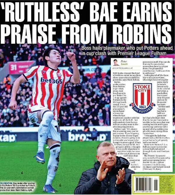 로빈스 감독 역시 경기 후 배준호의 활약을 언급했다. 영국 매체 '더 센티널'에 따르면, 로빈스 감독은 "이제는 거의 경고에 가까운 메시지다. 골을 넣어야 한다. 10번 역할로 뛰려면 득점을 해야 하고, 이 팀의 일원이 되려면 골을 향한 굶주림을 보여줘야 한다"고 말했다.
