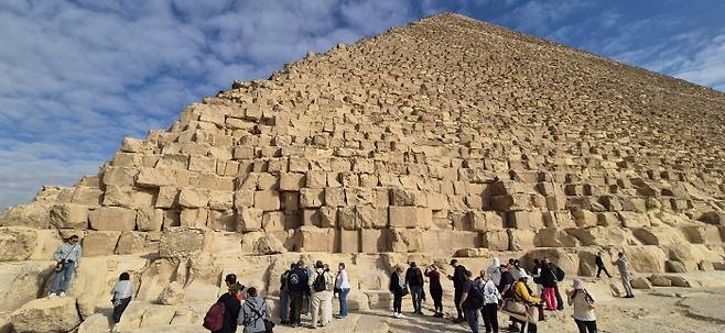 | ▲ 카이로 피라미드 피라미드는 현장에서 보면 꼭대기가 잘 안 보일 정도로 그 거대함이 실감 난다. 이제는 어느 문명도 이룰 수 없을 것 같은 거대함이 압도한다. |