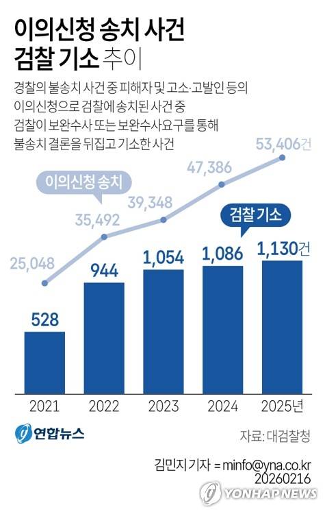 (서울=연합뉴스) 김민지 기자 = 16일 대검찰청 집계에 따르면 경찰의 불송치 사건 중 피해자 등의 이의신청으로 검찰이 보완수사를 거쳐 경찰 결론을 뒤집고 기소한 사건이 2021년 수사권 조정 이후 4년 만에 2배로 늘어난 것으로 나타났다.