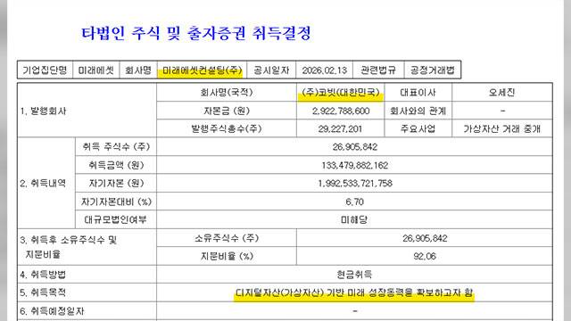 미래에셋증권 계열사인 미래에셋컨설팅은 지난 13일 공시를 통해 국내 가상자산거래소 코빗 주식 2,691만 주를 1,335억 원에 취득하기로 결정했다고 밝혔습니다.