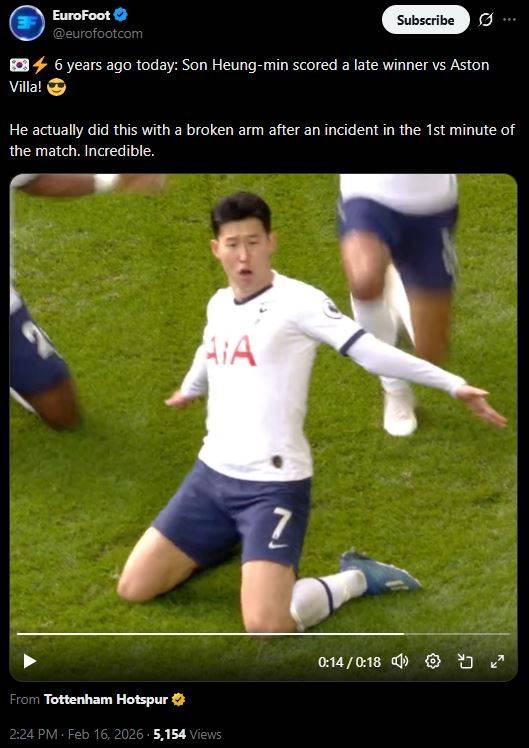 글로벌 축구 콘텐츠 매체 '유로풋'은 16일(이하 한국시간) "6년 전 오늘: 손흥민이 애스턴 빌라를 상대로 경기 막판 결승골을 터뜨렸다. 그는 경기 1분 만에 발생한 충돌 사고로 팔이 부러진 상태였음에도 끝까지 뛰며 이 골을 만들어냈다. 정말 믿기 힘든 투혼이었다"라는 설명과 함께 당시 득점 영상을 공개했다.