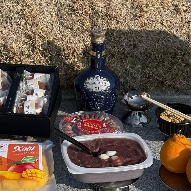 함께 공개된 또 다른 사진에는 위스키와 팥죽, 망고, 견과류 등 정갈한 음식들이 놓여 있어 세심한 효심을 엿볼 수 있게 했다.