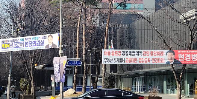 국민의힘 플래카드는 이름과 얼굴 사진이 기본적으로 들어가고, 왼쪽에 배치하는 문구만 달라집니다. 이번 것은 유난히 시뻘겋습니다. 뭔가 공격적이랄까 선동적입니다. 하지 말라, 왜냐하면 주민에게 손해를 끼친다, 나아가 공공선을 해친다고 할 때 저렇게 플래카드를 만듭니다. 이번 것이 딱 그렇습니다.
