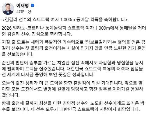 이 대통령은 "지칠 줄 모르는 체력과 폭발적인 가속력으로 '람보르길리'라는 별명을 얻은 김길리 선수는 첫 올림픽 출전이라는 사실이 믿기지 않을 만큼 노련한 경기 운영을 선보였다"며 "순간의 판단이 승부를 가르는 치열한 접전 속에서도 과감함과 냉철함을 동시에 발휘하며 트랙을 질주했다. 대한민국 쇼트트랙 특유의 저력과 집념을 전 세계에 다시금 증명해 보인 뜻깊은 성과"라고 칭찬했다.