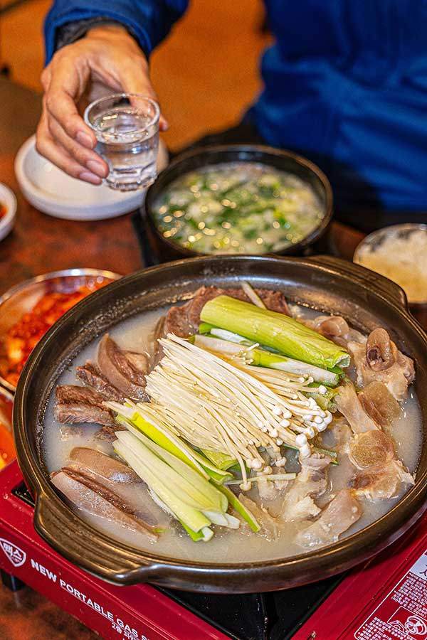 추운 겨울, 얼어붙은 몸을 이끌고 산에서 내려와 찾게 되는 건 역시 뜨끈한 국물이다. 여기에 푸짐한 고기건더기까지 더해진다면 술안주로 이만한 게 또 있을까. 반투명한 육수에 수육이 반쯤 잠겨 보글보글 끓어오르면, 큼직하게 썰어 얹은 대파와 팽이버섯이 땀을 흘리기 시작한다. 이때 국물을 한 입 떠먹으면 해물탕 못지않은 시원한 맛이 펼쳐진다. 소주와 막걸리, 어느 쪽과도 잘 어울린다. 두툼한 소머리고기와 쫄깃한 도가니는 씹는 맛이 좋고 포만감도 있어 술이 막 들어간 빈속을 든든히 달래준다.
