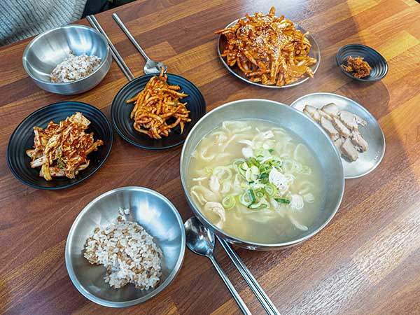 대표 메뉴인 닭칼국수를 포함한 모든 칼국수 메뉴는 국내산 생닭과 황태, 남해 바지락으로 우려낸다. 모든 재료는 냉동이 아닌 생물을 사용해 국물이 시원하고 깔끔하다. 면은 일반적인 칼국수 면보다 넓적하고 얇은 편이다. 익힘 정도가 적당해 퍼지거나 밀가루 냄새가 나지 않고 쫄깃한 식감이 좋다. 맛보기 수육 세트가 있어 부담 없이 수육을 주문할 수 있다. 맛보기 수육은 여섯 점 정도 나온다. 닭무침에 함께 무쳐진 야채들을 수육과 곁들여 먹어도 정말 맛있다.