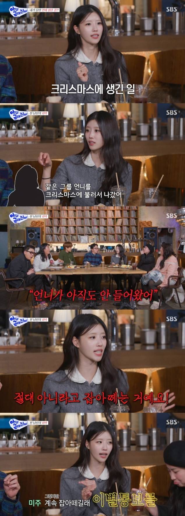 이미주는 "친구가 내 남자친구가 (친구와) 같은 그룹 언니를 크리스마스에 불러서 나갔고, 언니가 아직도 아직도 안 들어왔다고 하더라"며 "그 이야기를 듣고 알겠다고 하고 바로 전화했는데 절대 아니라고 잡아떼는 거다"고 털어놓았다.