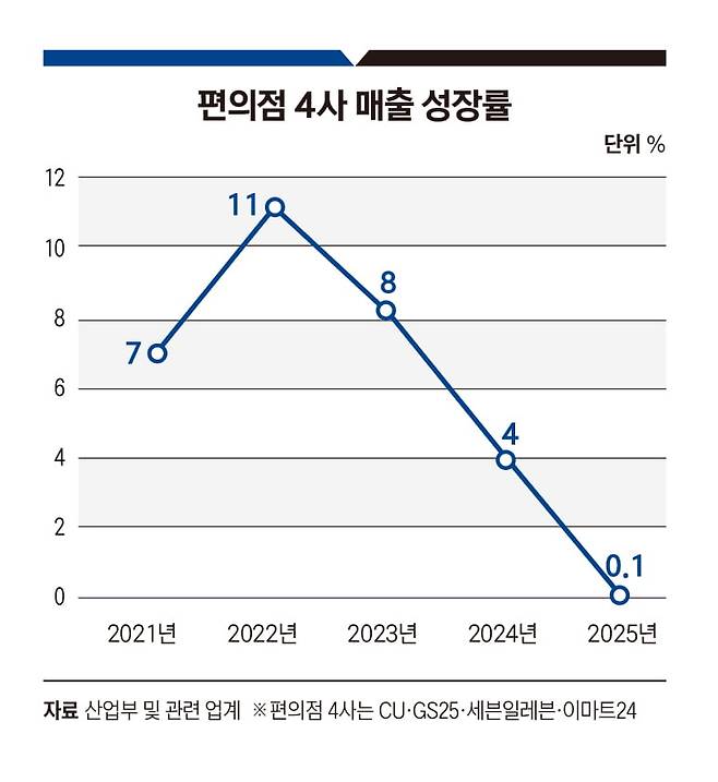 이런 맥락에서 편의점 업황 회복은 당분간 쉽지 않을 것이란 시각이 지배적이다. 실적 지표에서도 이러한 흐름은 고스란히 드러난다. 편의점 4사의 전체 매출 증가세는 해마다 둔화하는 추세다. 편의점 4사의 전년 대비 매출 성장률은 2023년 8.0%에서 2024년 4%, 지난해에는 0.1%로 추락했다.
