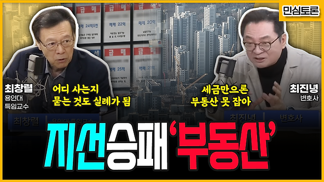 ▶ 최창렬 : 여러 가지가 있기 때문에 이건 여야의 문제가 정말 아니에요. 그런데 그건 우리 최 변호사님 말씀이 맞아요. 노무현 정권 때, 문재인 정부 때 아파트 폭등했죠. 제가 알기에 오히려 박근혜 정권 때는 좀 안정된 면이 없지 않았어요. 이명박 정부 때도 그랬고. 그러다 보니까 이른바 진보 정권에서는 오히려 부동산 가격이 안정이 안 됐다. 저는 일리 있는 비판이라고 봅니다. 바로 그렇기 때문에이재명 대통령이 더욱더 그렇게 SNS를 통해서도 그렇고 자신의 부동산 안정에 대한 의지를 강력히 밝히는 것이다. 그래서 거기에 대해서 비판할 점이 있으면 비판을 하고 또 의미가 있는 정책은 그것대로 의미가 있잖아요. 아니, 다주택자들의 그런 도덕적 해이가 분명히 있어요. 이 공동체에서 자신만 잘살겠다는 거 아닙니까? 그게 이기적 본능이긴 해요. 그런데 그걸 국가가 막아야죠. 그게 왜 문제가 되냐고요, 도대체가.