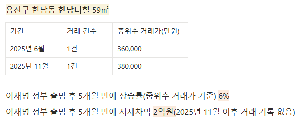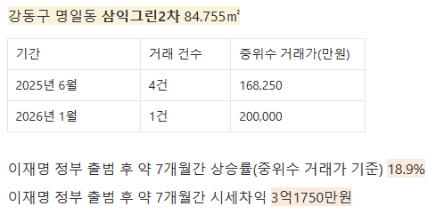 얼마나 올랐는지 한번 볼까? 이재명 정부가 지난해 6월 4일에 출범했으니, 2025년 6월과 2026년 1월을 비교해 보자. 국토부 실거래가 기준으로 몇몇 단지의 2025년 6월 한 달간의 중위수 거래가와 2026년 1월 한 달간의 중위수 거래가를 간단하게 비교해 봤다.