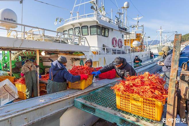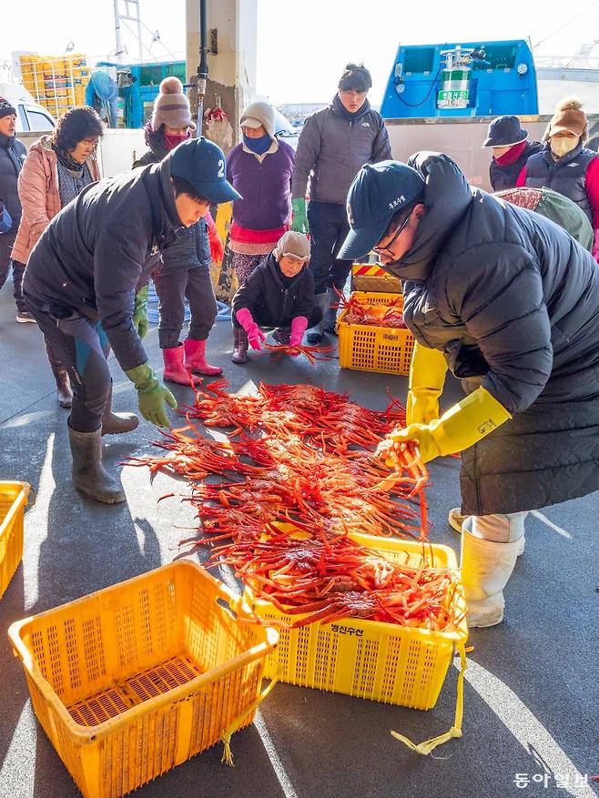 그렇다면 오늘은 항구의 일출을 감상해볼까. 여기는 울진대게의 본산인 후포항이 아니겠는가. 붉은 태양과 어우러지는 붉은대게(홍게)와 울진대게의 향연. 한겨울 동해에서만 볼 수 있는 항구의 분주한 아침 풍경이다.