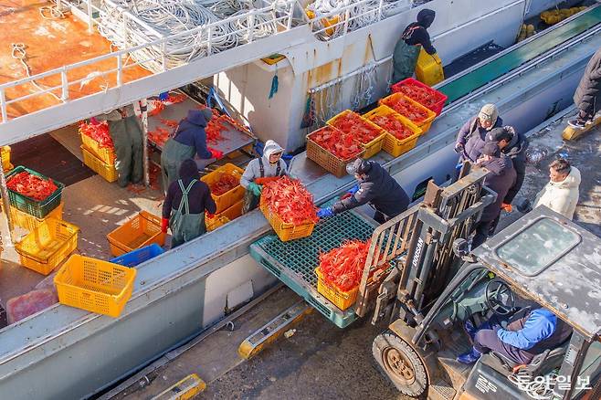 동이 트는 항구에는 커다란 어선 두척이 정박해 있었다. 장화를 신은 일꾼들이 배 창고에 실려 온 대게를 꺼내 테이블 위에서 정리하고, 노란 플라스틱 박스에 담는다. 그리고 항구에 도착한 트럭에 빠르게 옮겨싣고 있다.