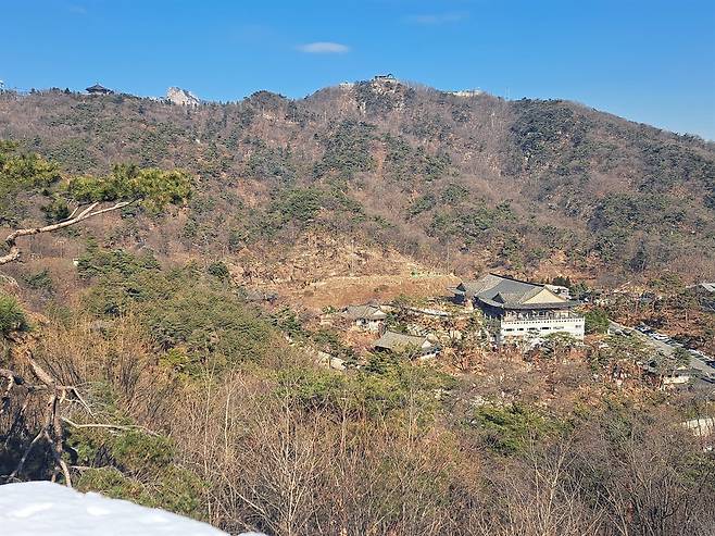 | ▲ 한양도성 숙정문 구간 중간 큰 소나무들이 우거진 곳이 숙정문이고, 그 위로 뻗은 성벽 위가 능선 셋이 만나는 '곡성' 구간이다. |