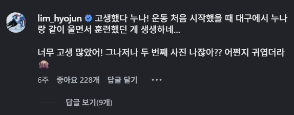 린샤오쥔은 "고생했다 누나! 운동 처음 시작했을 때 대구에서 누나랑 같이 울면서 훈련했던 게 생생하네…"라며 "너무 고생 많았어! 그나저나 두 번째 사진 나잖아?? 어쩐지 귀엽더라"라고 했다.