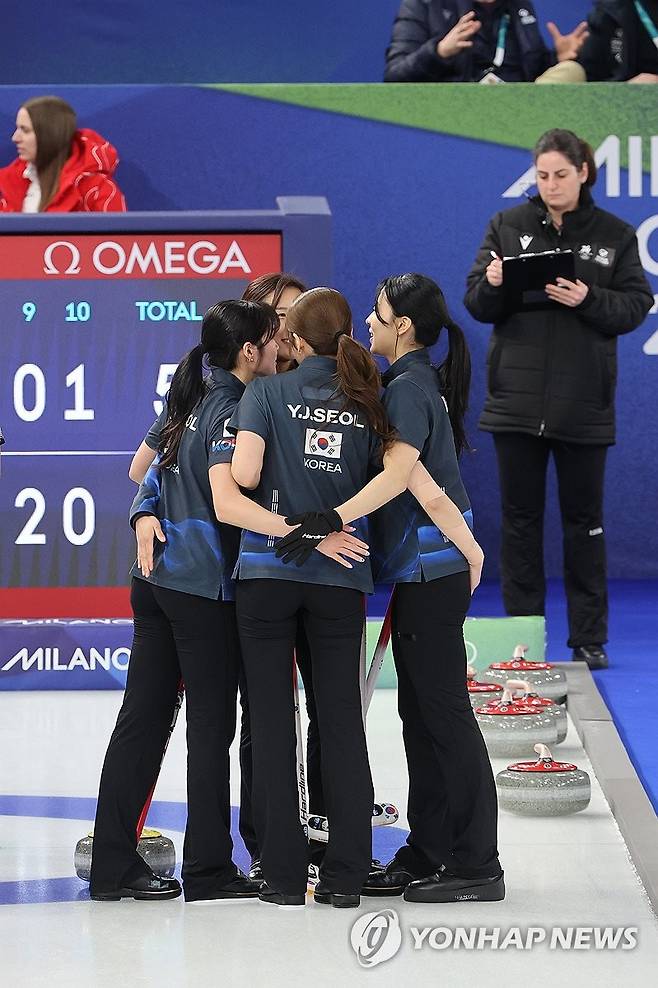 (코르티나담페초=연합뉴스) 서대연 기자 = 17일(현지시간) 이탈리아 코르티나담페초 컬링 올림픽 스타디움에서 열린 2026 밀라노ㆍ코르티나담페초 동계올림픽 컬링 여자 라운드로빈 한국과 스위스의 경기에서 5-7로 패한 한국 대표팀 선수들이 경기가 끝난 뒤 서로를 격려하고 있다. 2026.2.18