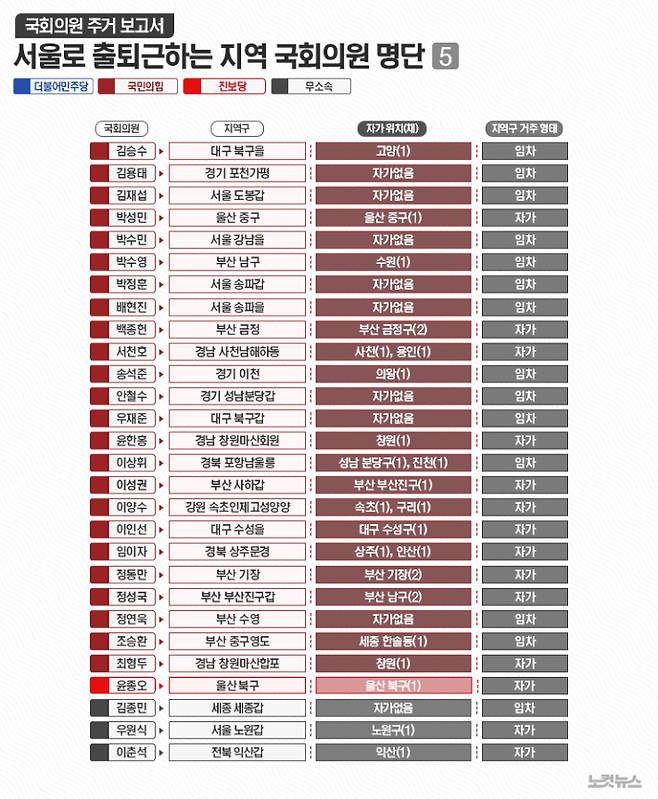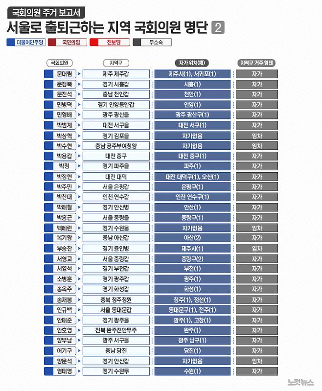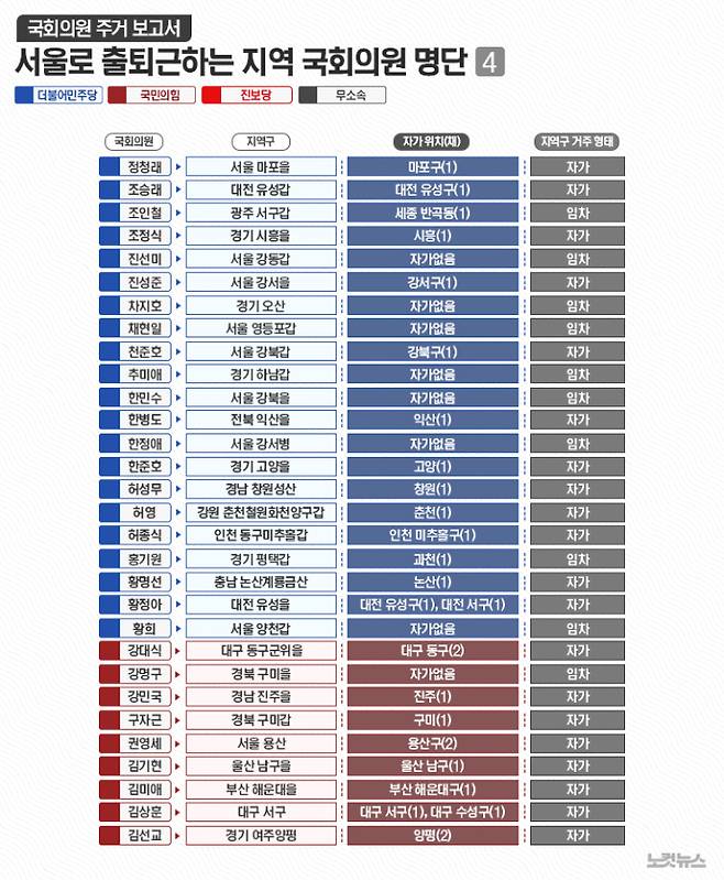 한편 국민의힘 조지연 의원(경북 경산)과 민주당 이개호 의원(전남 담양·함평·영광·장성군)은 본인 지역구가 아닌 지역에 주택을 보유하고 있었다. 국민의힘 주진우 의원(부산 해운대갑)은 자가 주택 없이 서울 강남구 압구정동 아파트를 전세로 임차해 살고 있다.