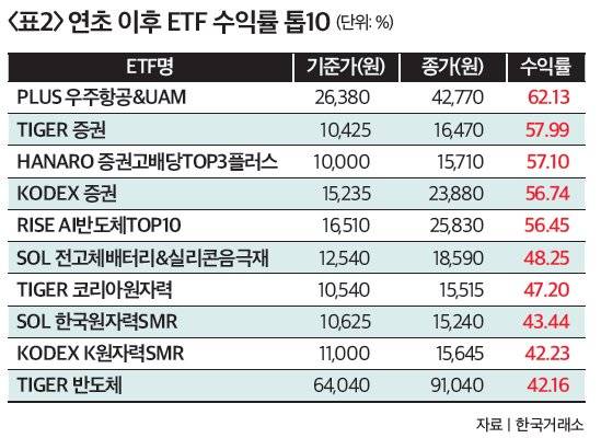 레버리지를 제외하면 올해 상승폭이 큰 테마는 우주항공, 증권, 반도체, 이차전지, 원자력이다(표2 참조). 먼저 'PLUS 우주항공&UAM'은 수익률 62.13%로 12위에 올랐는데, 수익률이 레버리지 상품 못지않다. 세계 최대 우주기업 스페이스X가 올해 기업공개(IPO)를 추진하고 있는 가운데 우주항공산업 성장 기대감에 자금이 몰린 영향이다. 위성시스템 개발업체 쎄트렉아이를 중심으로 인텔리안테크, 한화시스템, 한국항공우주, 에이치브이엠 등을 담고 있다.올해 기록적인 '불장'에 힘입어 증권주 관련 ETF도 수익률 상위에 랭크됐다. 'TIGER 증권'(57.99%), 'HANARO 증권 고배당 TOP 플러스'(57.10%), 'KODEX 증권'(56.74%) 순이다. 올해 들어 미래에셋증권이 122.27% 급등하며 관련 주요 상품의 수익률 증가를 이끌었다. 키움증권과 삼성증권도 각각 55.09%, 26.79% 상승했다.