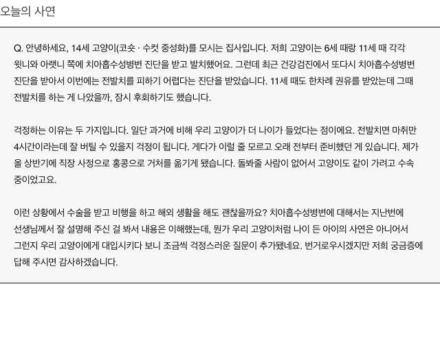 안녕하세요. '24시 센트럴 동물메디컬센터' 원장이자 '24시간 고양이 육아대백과'의 저자 김효진 수의사입니다. 오늘은 노령 고양이의 전발치 결정을 앞두고 고민이 되신 집사님이 사연을 보내주셨네요.