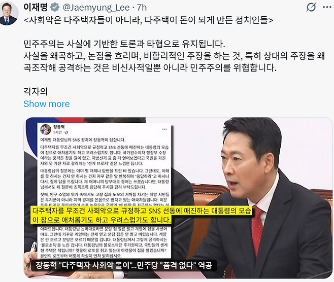 다주택자 문제를 두고 연일 SNS를 통해 공방이 벌어지고 있는 상황에서 자신의 주장을 상대가 왜곡하고 있다는 점을 분명하게 지적한 대목이다.
