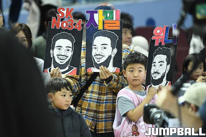 경기가 끝나고 SK 자밀 워니의 승리 인터뷰가 이어졌다. 명절 연휴에 농구를 즐기러 온 SK 농구 팬들이 자밀 워니의 인터뷰를 지켜봤다. 자밀 워니를 응원하는 어린이 팬들은 손수 만든 응원 도구를 들고 자밀 워니의 인터뷰를 지켜봤다. KBL 스타에 대한 아이들의 똘망똘망한 눈망울은 인터뷰 내내 자밀 워니에서 한시도 떼지 못했다.