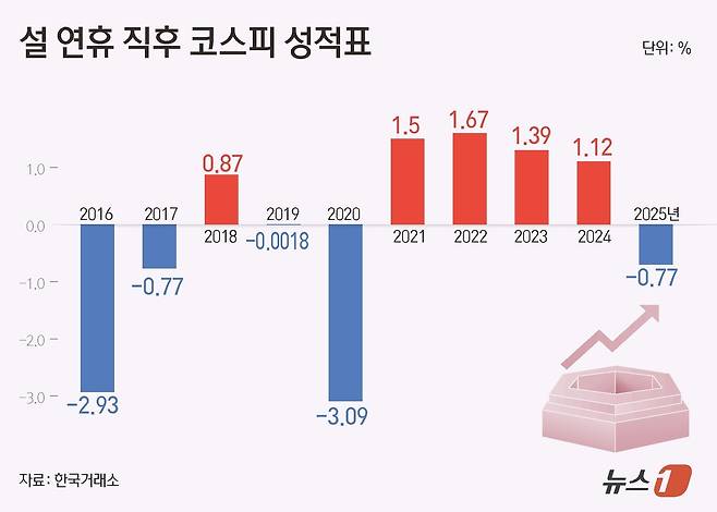 (서울=뉴스1) 김초희 디자이너 = 명절 연휴 이후 주가가 반등한다는 이른바 '명절 효과'가 통계적으로는 근거가 희박한 것으로 나타났다. 최근 10년간 설 연휴 직후 코스피가 상승 곡선을 그린 경우는 절반 정도에 그쳐, 투자자들의 막연한 기대와는 다른 결과가 나왔다. 18일 한국거래소에 따르면 최근 10년간 설 연휴 직후 5거래일간 코스피가 상승한 연도 수는 5회, 하락한 연도 수는 5회였다. 지난 10년간 상승률이 가장 높았던 해는 2022년으로, 설 연휴 직후 5거래일간 코스피가 3.96% 상승했다. 당시 낙폭 과대에 따른 반발 매수세가 강하게 유입된 영향이다. 이어 2023년(1.24%), 2018년(1.23%), 2021년(0.23%) 순으로 강세를 보였다.