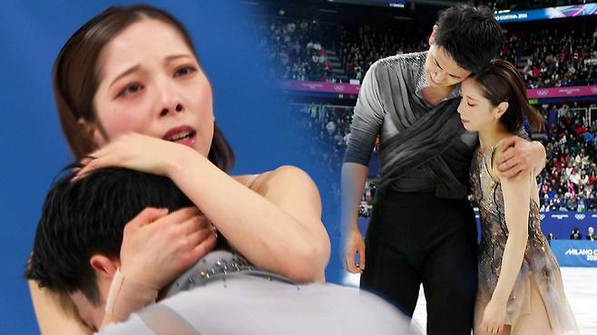 시작 프리 프로그램을 마치고, 부둥켜안으며 눈물을 흘리는 두 사람.