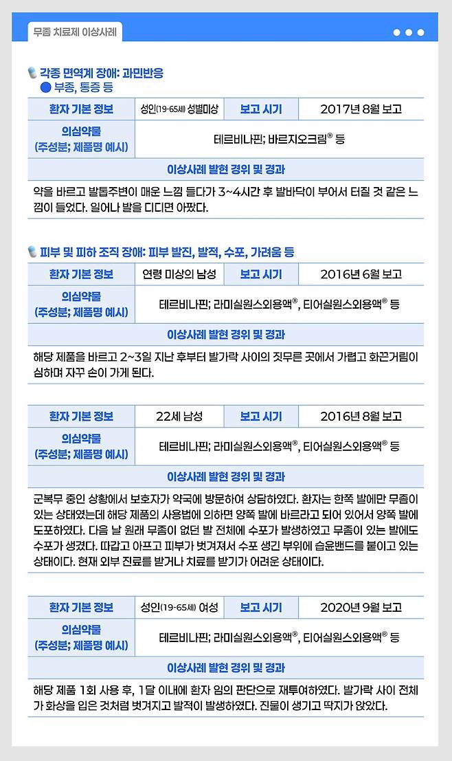 먼저 2017년 8월 보고된 사례에서는 성인(19~65세)에서 테르비나핀 성분 외용제를 바른 뒤 발톱 주변에 매운 느낌이 들기 시작했고, 3~4시간 후에는 발바닥이 부어 터질 것 같은 압박감과 통증을 호소했다. 기립하거나 보행 시 통증이 심해지는 양상을 보였다. 해당 사례는 부종과 통증 등 과민반응으로 분류됐다.
