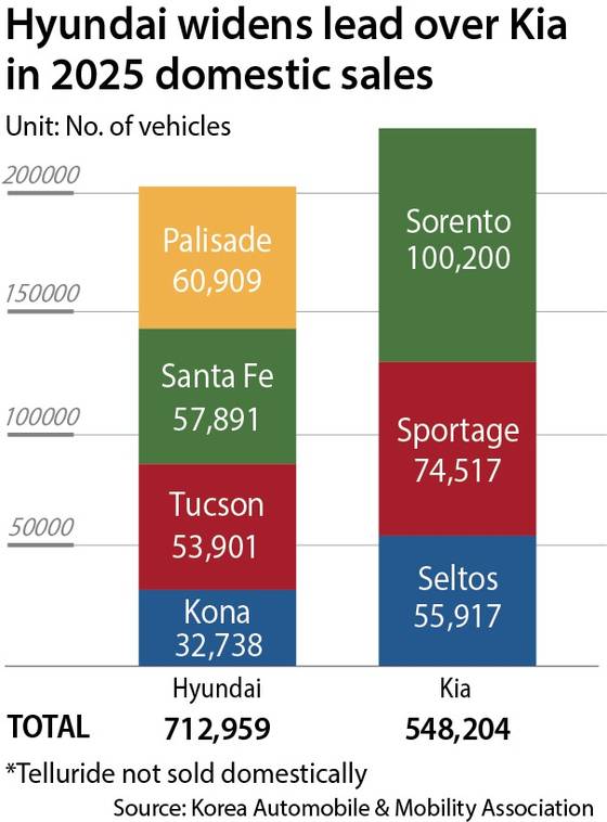 In the domestic market, where sedans remain popular, Hyundai Motor still leads Kia thanks to its solid lineup, including the Avante, Sonata and Grandeur. Last year, Hyundai Motor sold 712,959 vehicles in Korea, while Kia sold 548,204 units — a gap of more than 160,000 vehicles.