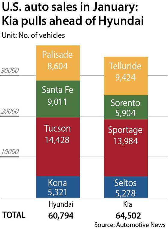 According to U.S. auto sales data for January, Kia sold 64,502 vehicles in the U.S., edging out Hyundai Motor’s 60,794 units, which include sales of its flagship Genesis luxury brand. It marked the first time Kia surpassed its larger sister affiliate in monthly U.S. sales. Hyundai Motor Group sold a combined 125,296 vehicles in the U.S. during the month, its highest January total on record.